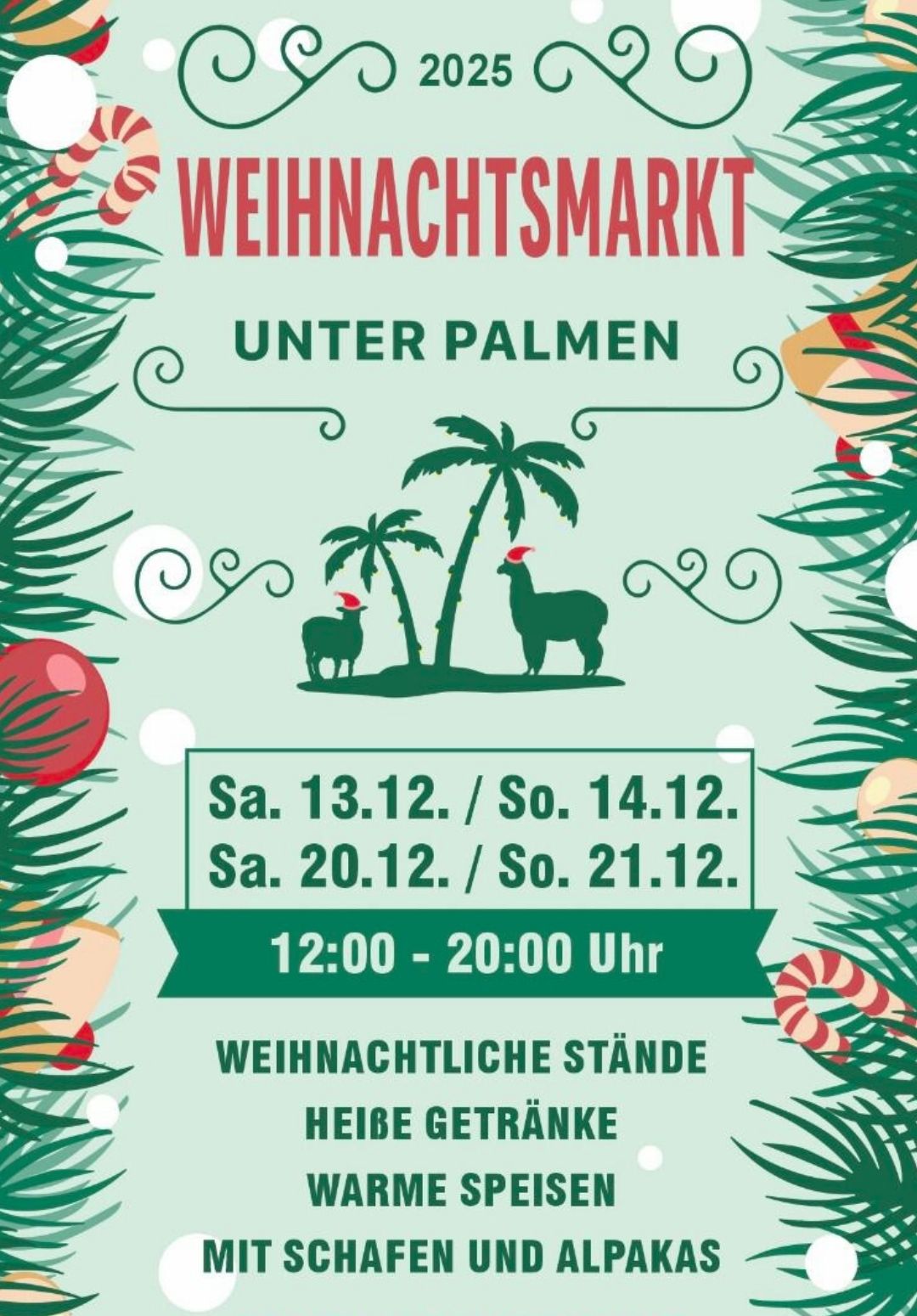 Am 13. & 14. Dezember sowie am 20. & 21. Dezember findet wieder unser Weihnachtsmarkt unter Palmen statt.